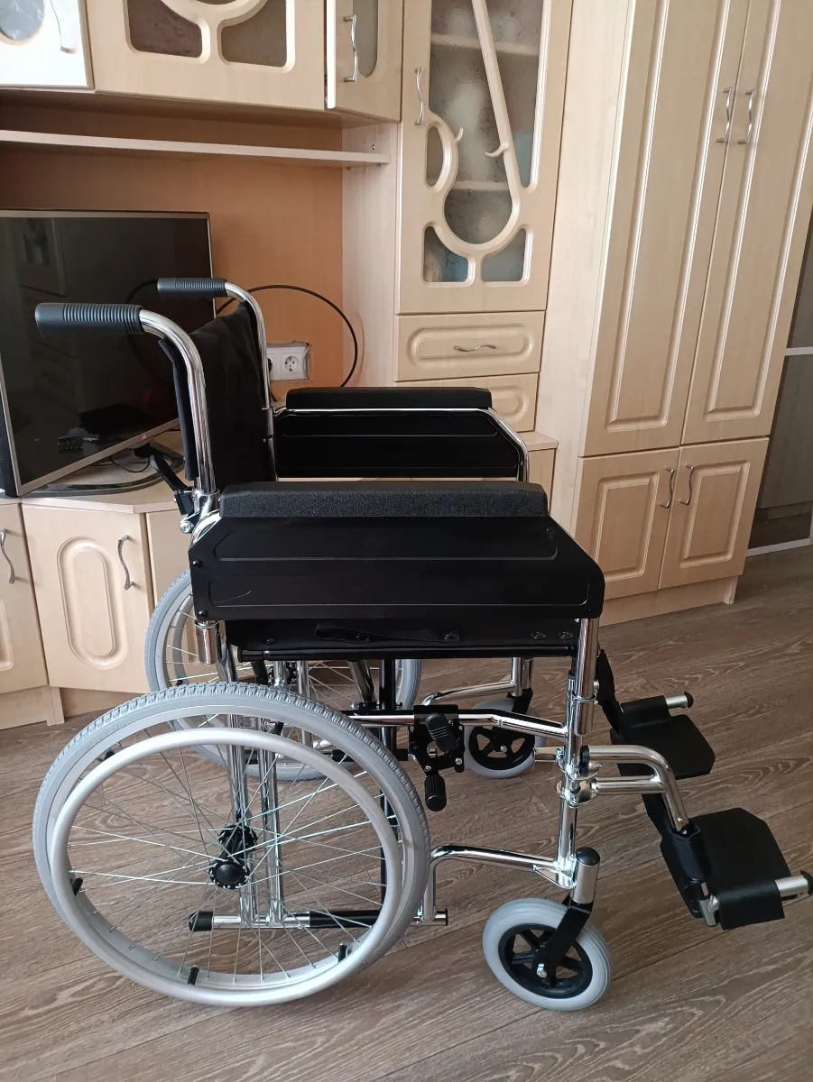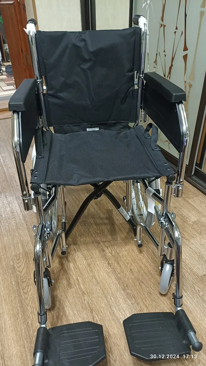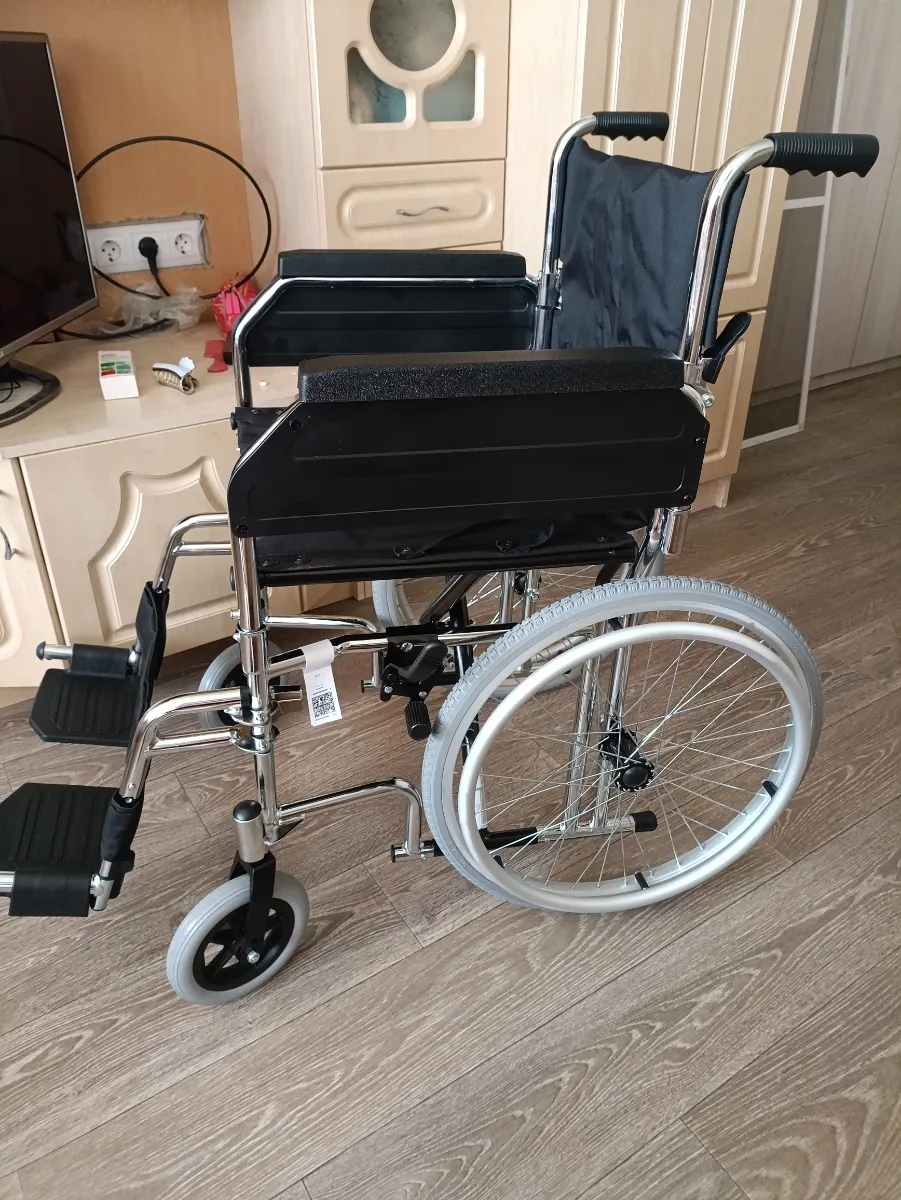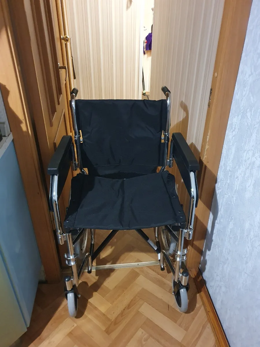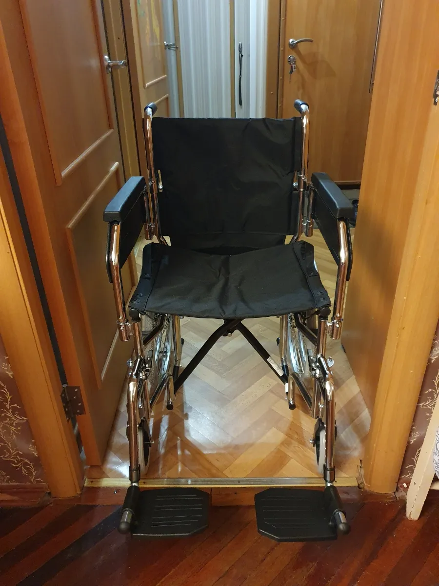 Пришла целая, в заводской упаковке. Дефектов не обнаружено. Качество коляски хорошие. Подлокотники и подножки снимаются и устанавливаются легко. В проемы квартиры (хрущёвки) проходит. В ванную комнату в зависимости на сколько близко от двери установлен унитаз.