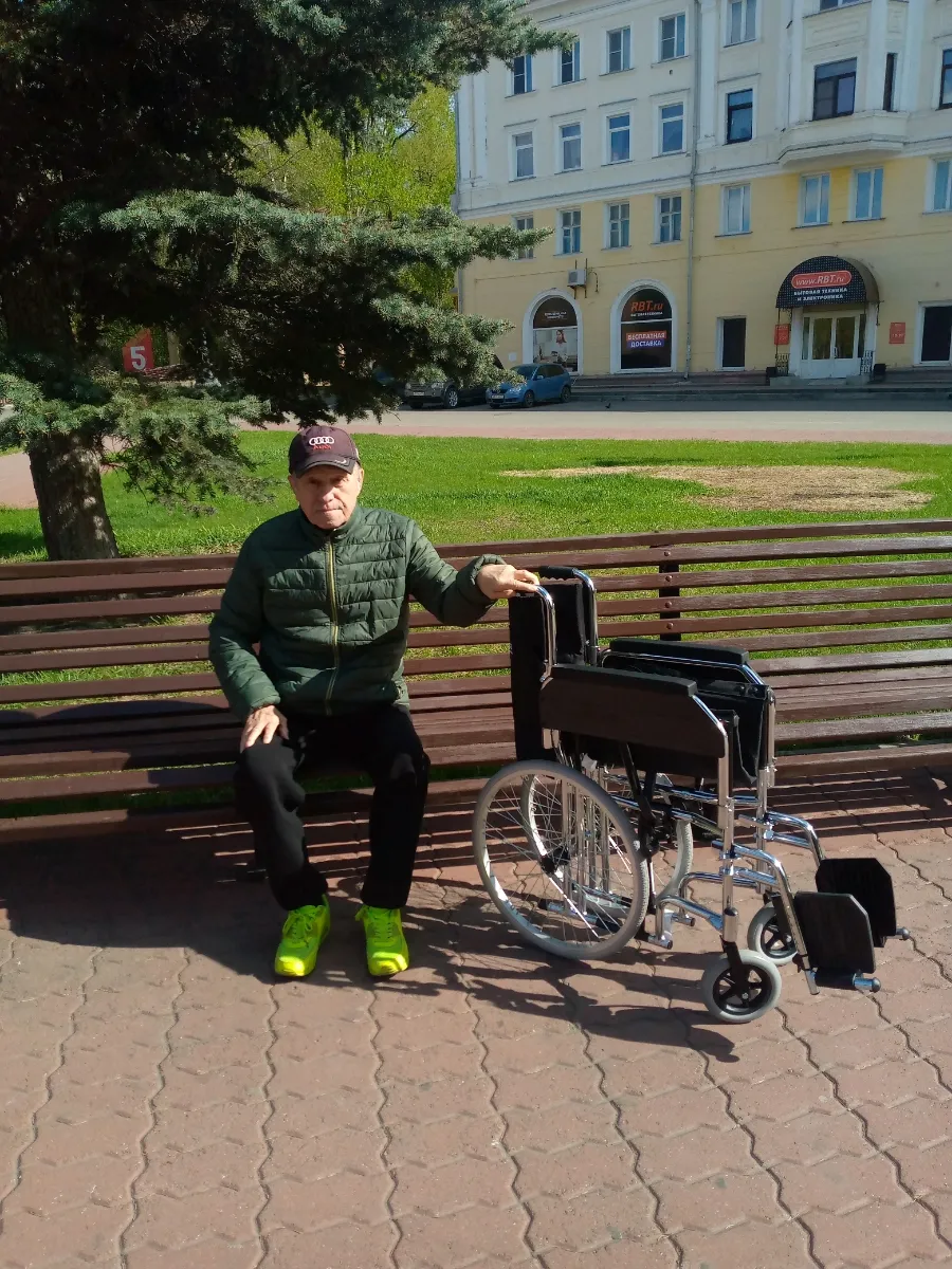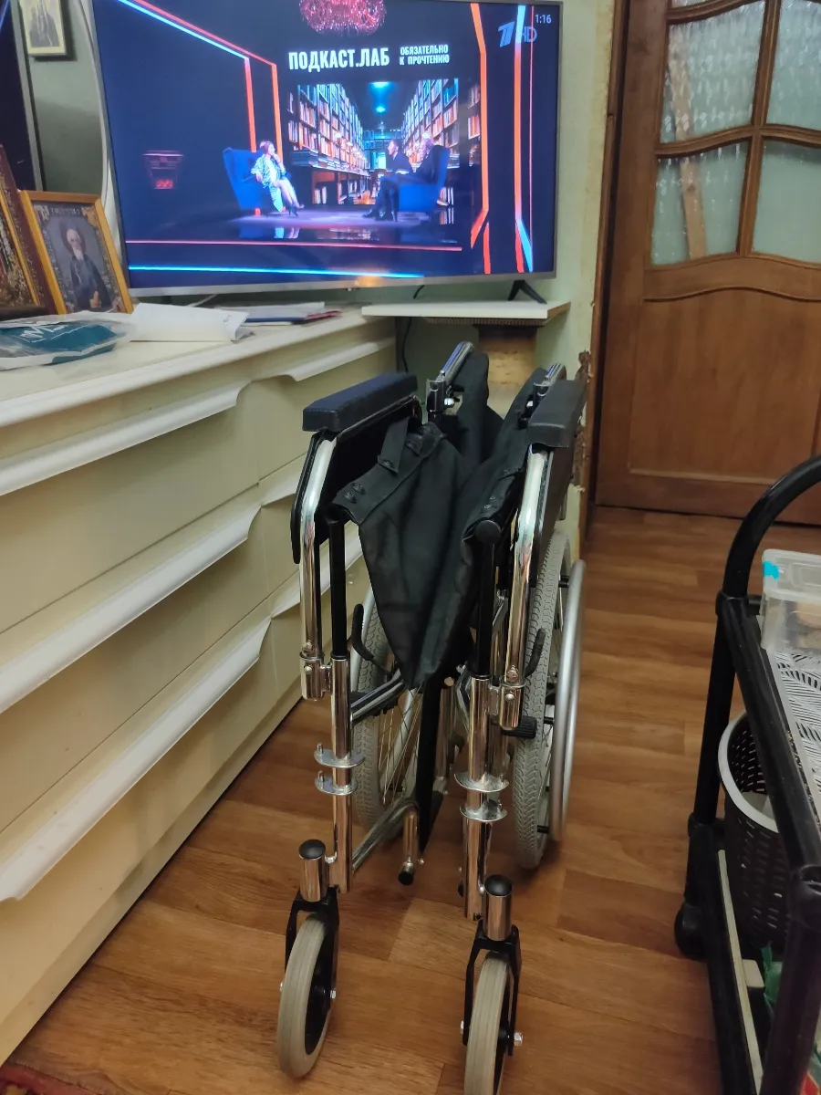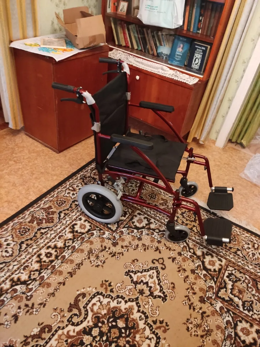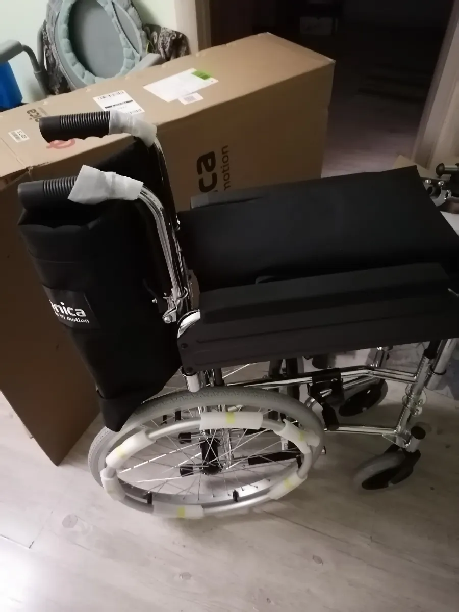 Получили коляску на дом с курьером бесплатно. Она собрана, только подножки отдельно упакованы и вложены. Надели, все просто. Только обода с колес сняли, не пригодятся. Коляска удобная!!! Выезжали на прогулку, удобно выносить с этажа, к сиденью пришиты ручки как у сумки. Маневренная, мужу удобно сидеть, широкое сиденье. Да и высота нормальная для невысокого человека, несмотря на то, что колеса спрятаны под сиденье. Коляску рекомендую, комфортная, узкая, легко собирается!