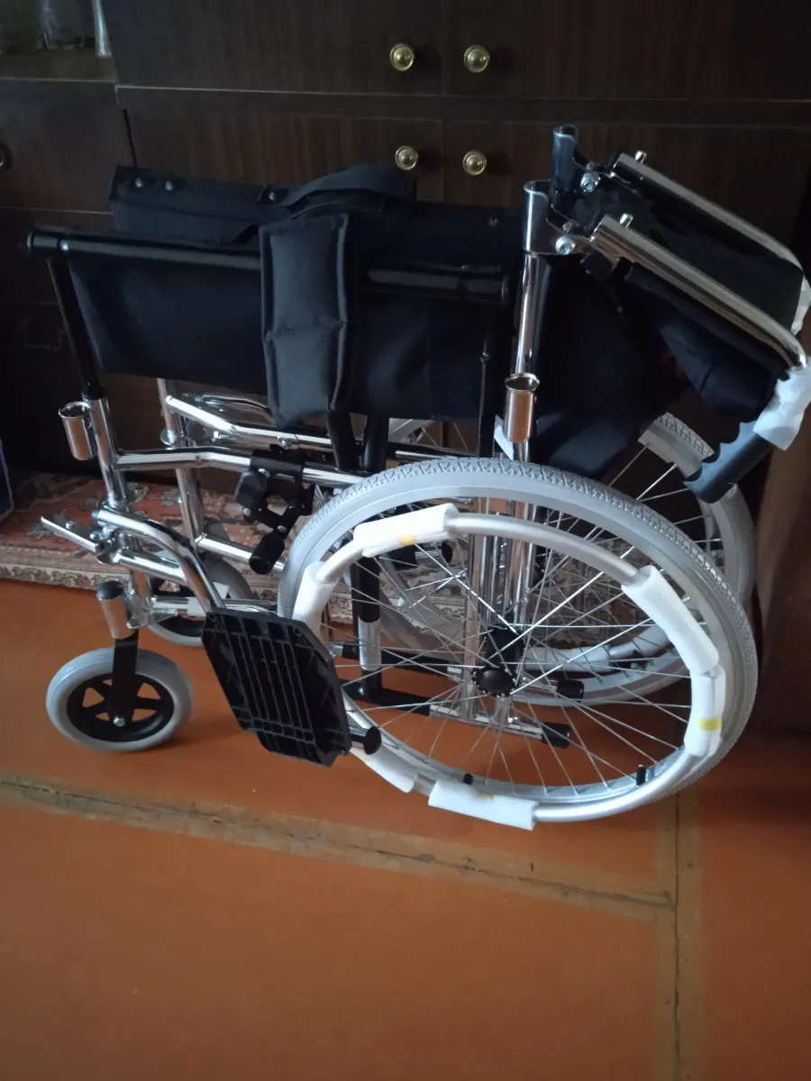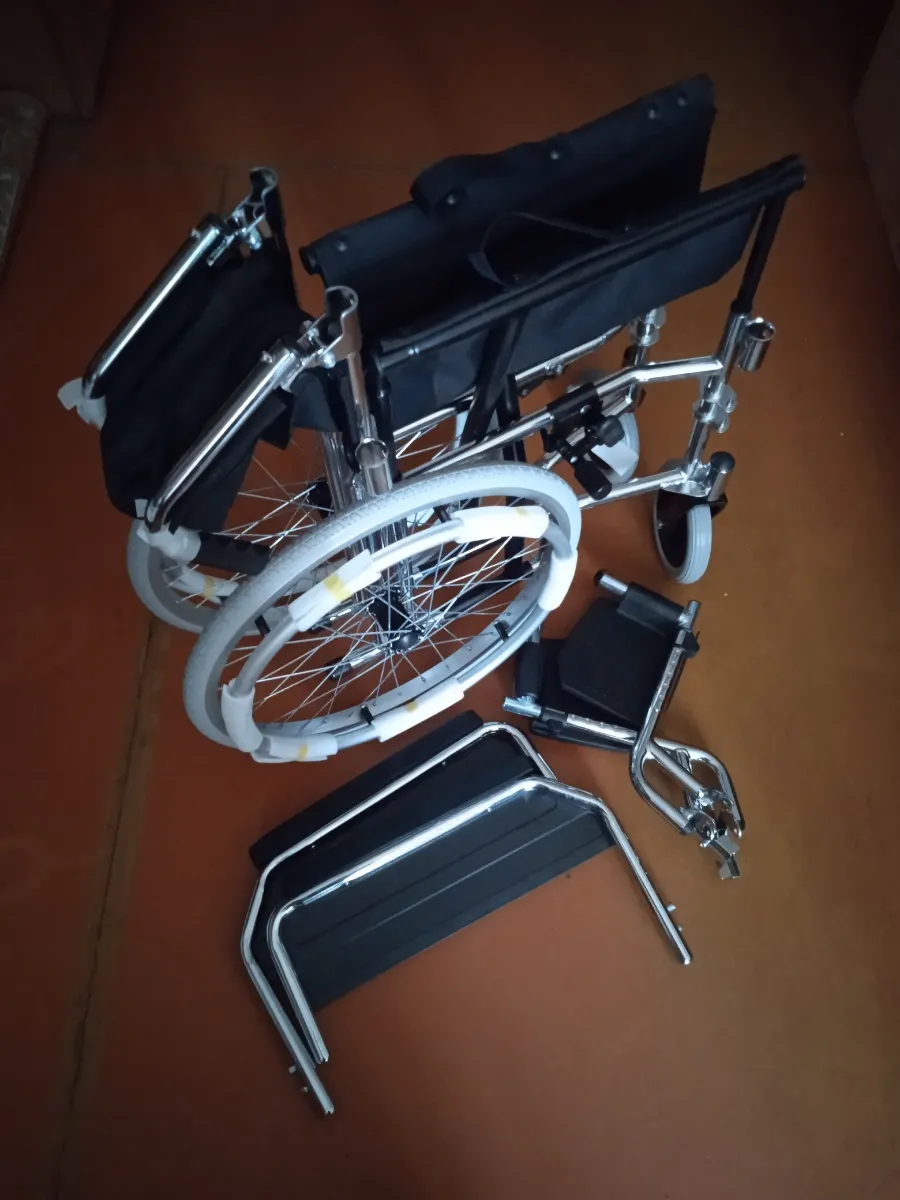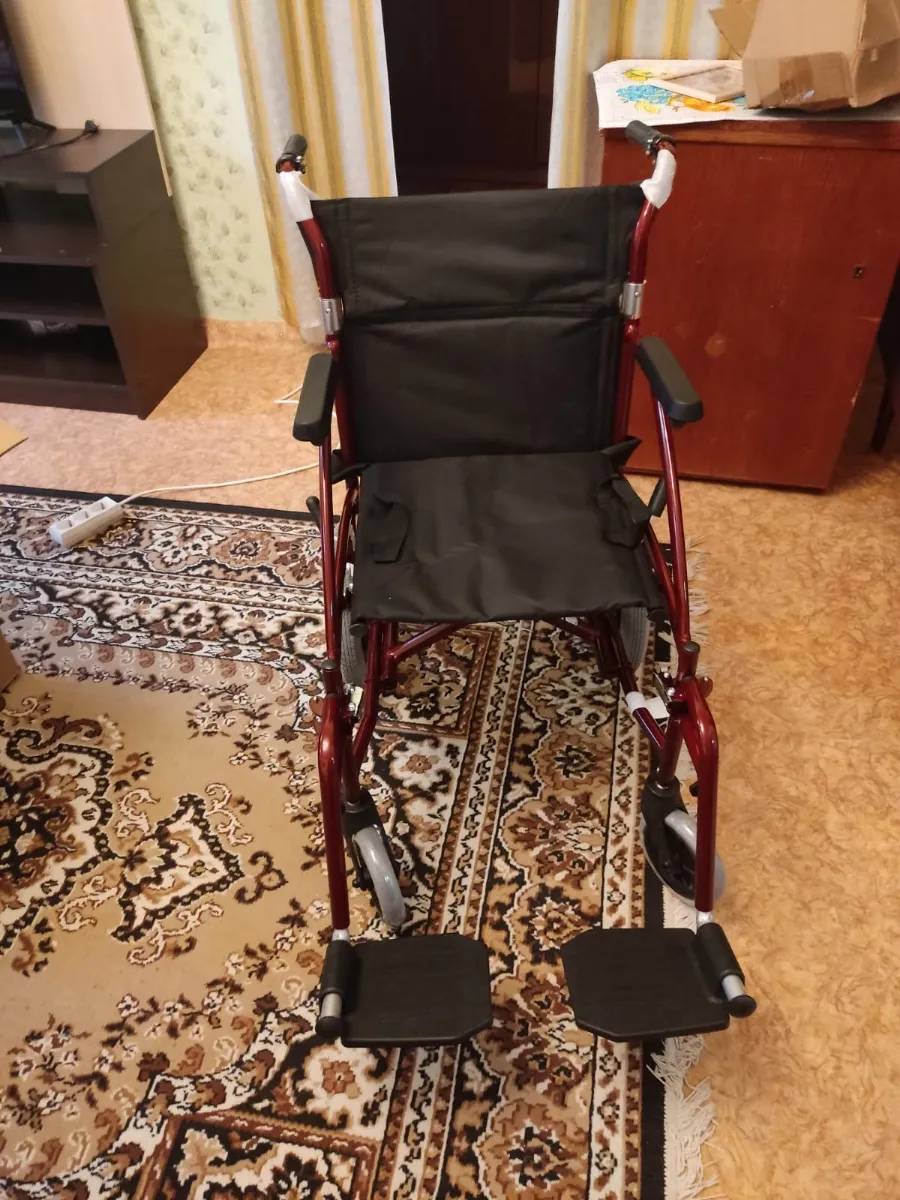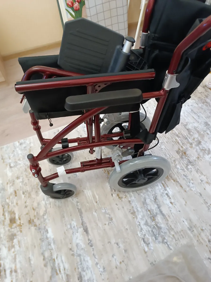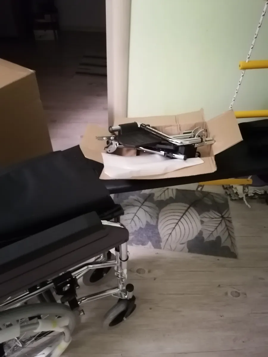 Получили коляску на дом с курьером бесплатно. Она собрана, только подножки отдельно упакованы и вложены. Надели, все просто. Только обода с колес сняли, не пригодятся. Коляска удобная!!! Выезжали на прогулку, удобно выносить с этажа, к сиденью пришиты ручки как у сумки. Маневренная, мужу удобно сидеть, широкое сиденье. Да и высота нормальная для невысокого человека, несмотря на то, что колеса спрятаны под сиденье. Коляску рекомендую, комфортная, узкая, легко собирается!