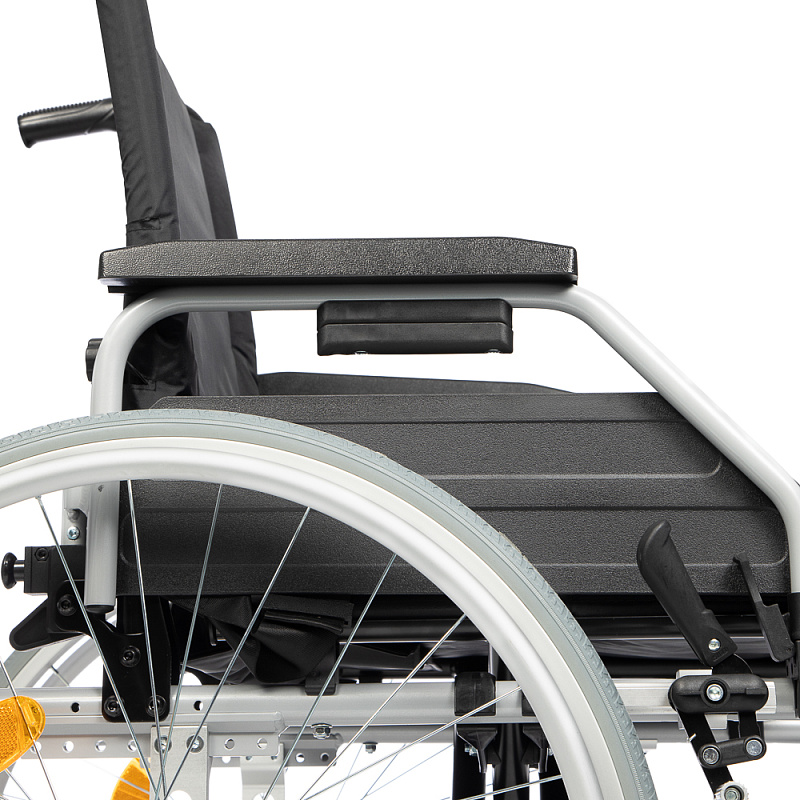 Инвалидная кресло-коляска оснащена ремнями безопасности, ремнями для стоп, карманом для мелочей на спинке.