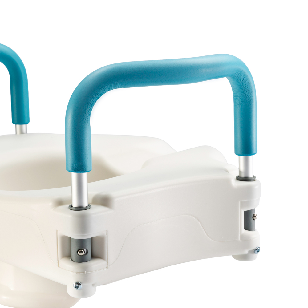 - Пластиковая насадка на унитаз со съемными поручнями увеличивает высоту унитаза
